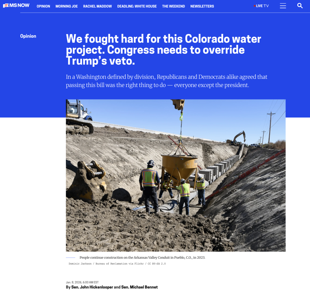In case you missed it, U.S. Senators John Hickenlooper and Michael Bennet penned an op-ed today in MS NOW detailing how critical the Arkansas Valley Conduit is for southeastern Colorado and calling on Congress to overturn Trump’s veto on their bipartisan, unanimous legislation to lower costs on the construction and complete the project.